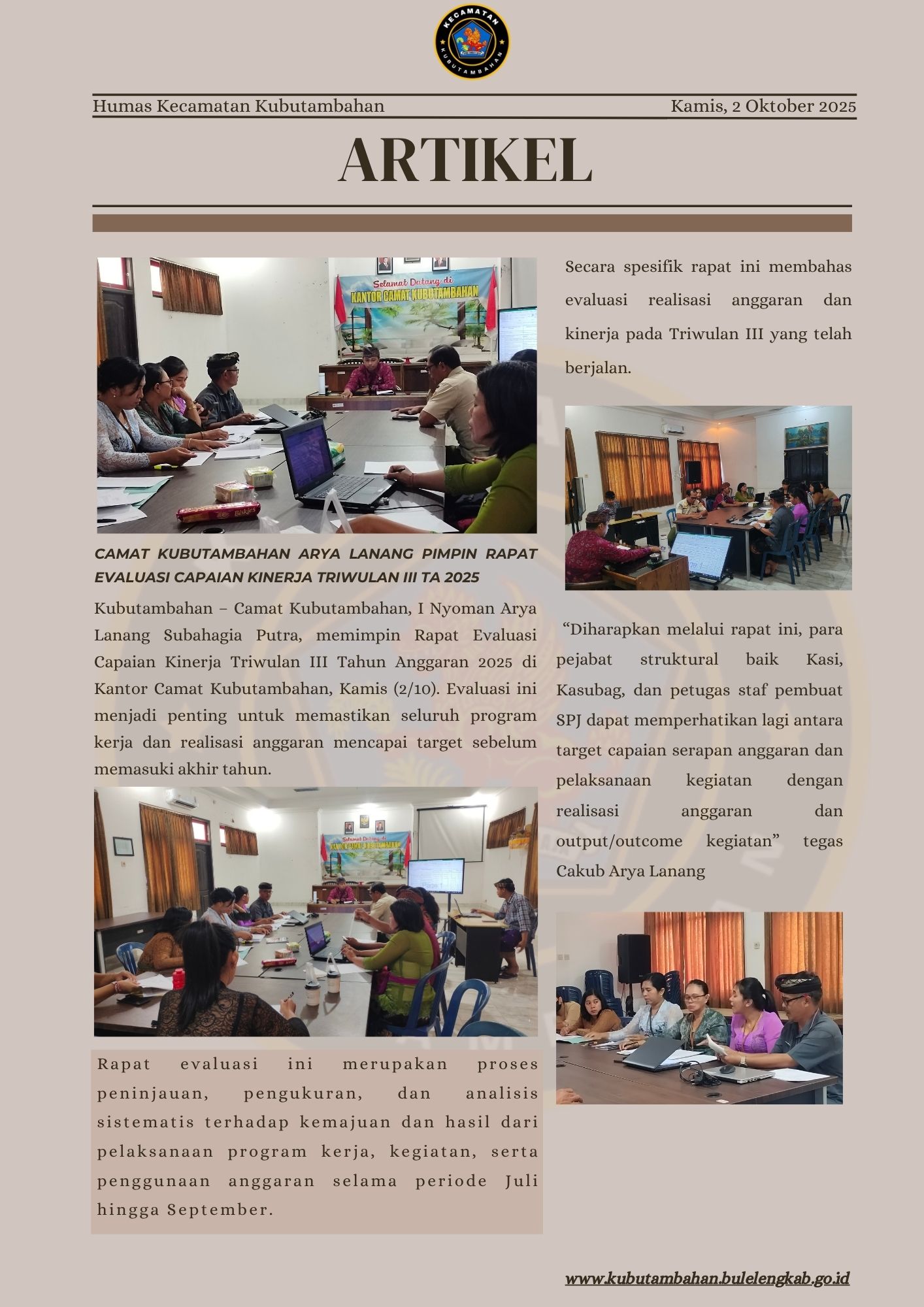 Camat Kubutambahan Arya Lanang Pimpin Rapat Evaluasi Capaian Kinerja Triwulan III TA 2025