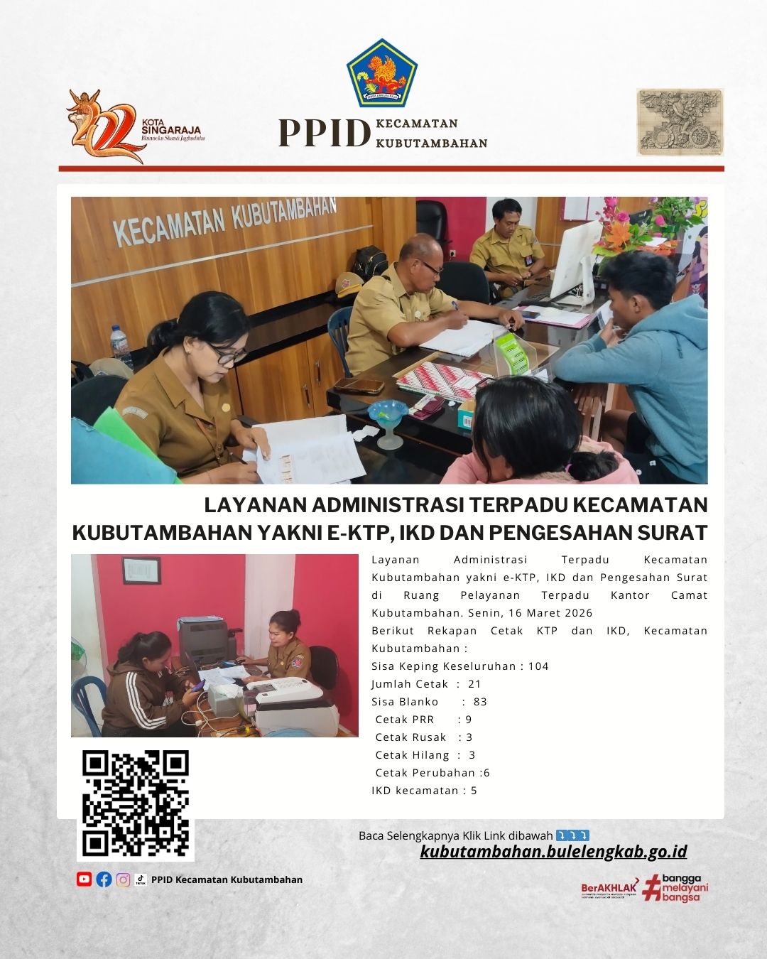 Pelayanan administrasi kependudukan di Ruang Pelayanan Terpadu Kantor Camat Kubutambahan kembali berjalan dengan lancar pada hari Senin (16/03/2026). Layanan yang diberikan kepada masyarakat meliputi pencetakan e-KTP, aktivasi Identitas Kependudukan Digital (IKD), serta pengesahan berbagai surat administrasi.