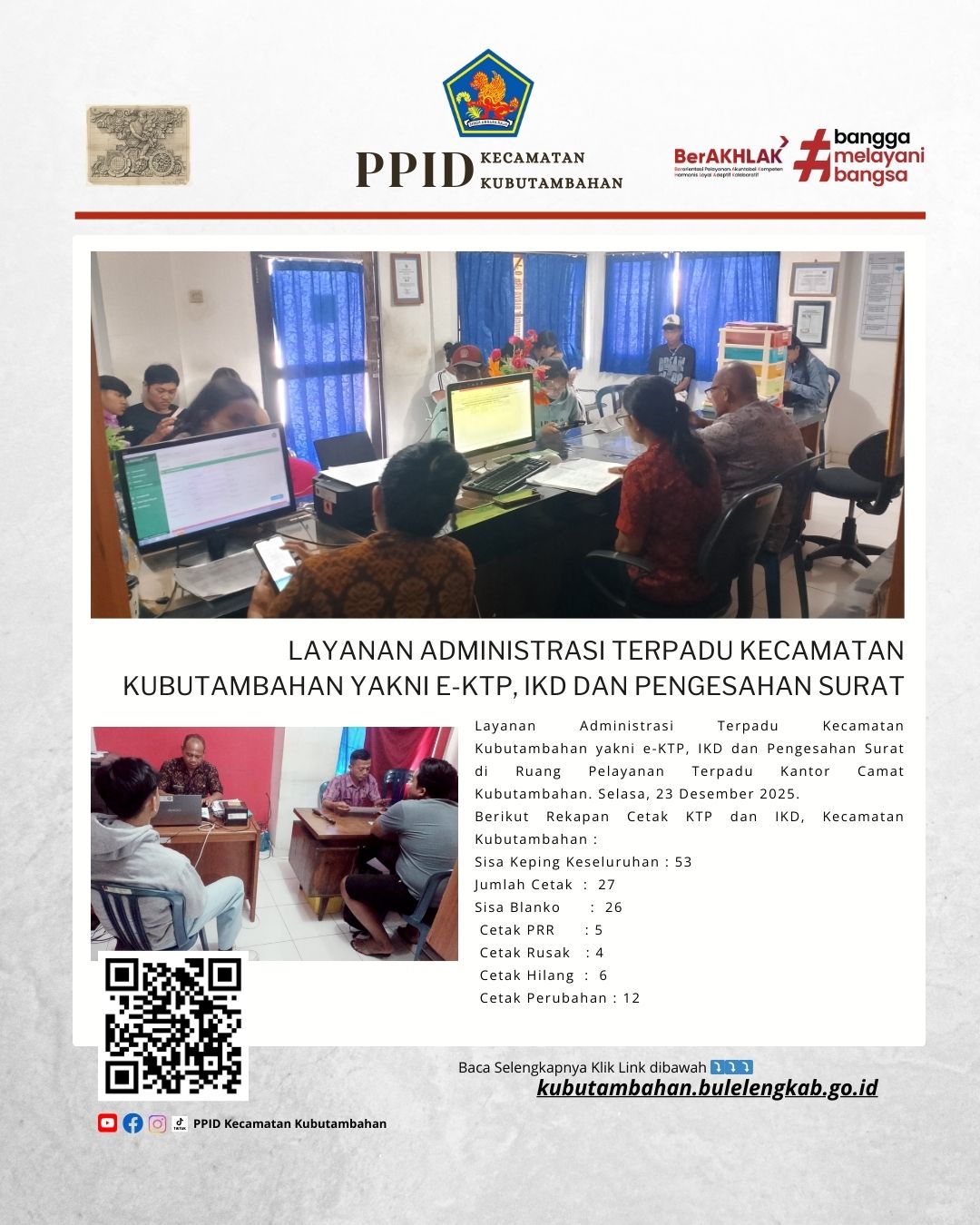 Layanan Administrasi Terpadu Kecamatan Kubutambahan yakni e-KTP, IKD dan Pengesahan Surat di Ruang Pelayanan Terpadu Kantor Camat Kubutambahan. Selasa, 23 Desember 2025.