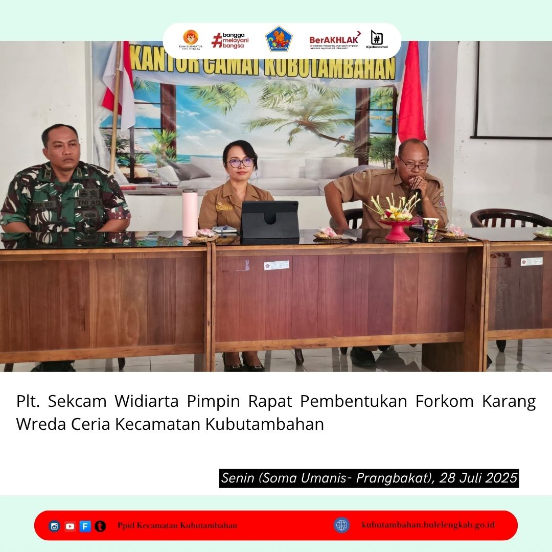 Kubutambahan, Buleleng – Rapat pembentukan Forum Komunikasi Karang Wreda Ceria Kecamatan Kubutambahan telah dilaksanakan pada Senin, 28 Juli 2025, di Ruang Rapat Kantor Camat Kubutambahan. Mewakili Camat, Plt. Sekretaris Kecamatan Kubutambahan, Made Widiarta membuka dan memimpin jalannya rapat.