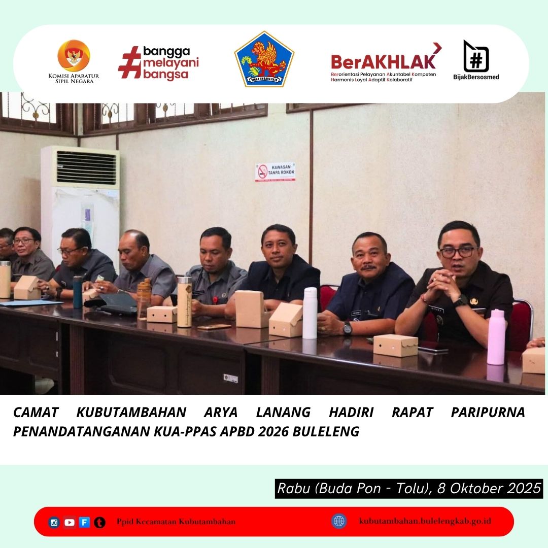 Dalam kesempatan ini hadir Bupati Buleleng, I Nyoman Sutjidra, didampingi Sekretaris Daerah (Sekda) Buleleng, Gede Suyasa, melakukan penandatanganan kesepakatan Kebijakan Umum Anggaran (KUA) dan Prioritas Plafon Anggaran Sementara (PPAS) Anggaran Pendapatan dan Belanja Daerah (APBD) Tahun Anggaran (TA) 2026 bersama Pimpinan DPRD Buleleng.