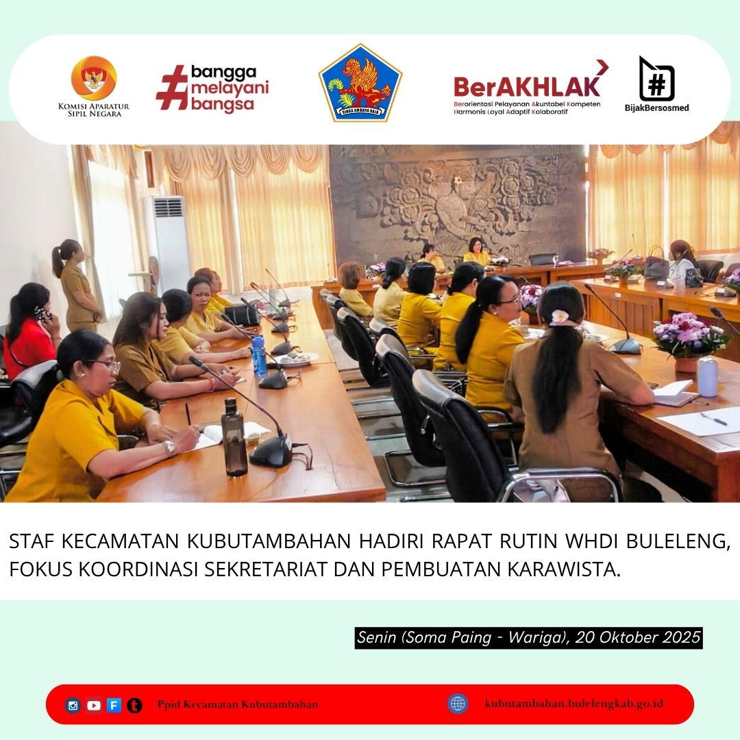 Buleleng - Mewakili WHDI Kecamatan Kubutambahan, Staf Kadek Suwarningsih menghadiri rapat rutin Wanita Hindu Dharma Indonesia (WHDI) Kabupaten Buleleng, di Ruang Rapat Rumah Jabatan Bupati Buleleng, Senin (20/10).