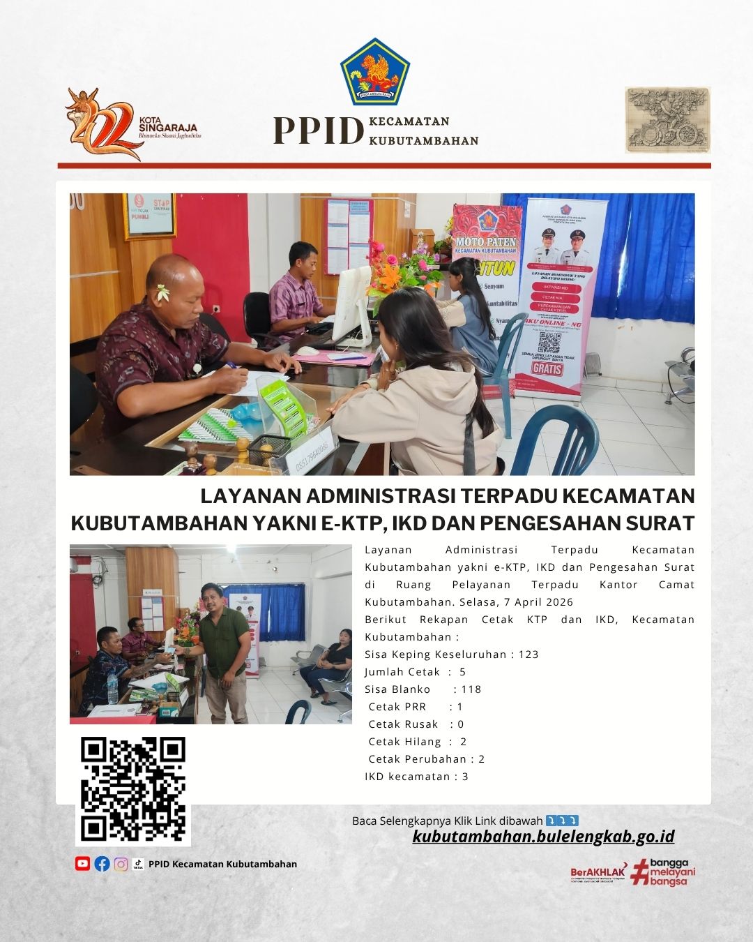 Layanan Administrasi Terpadu Kecamatan Kubutambahan yakni e-KTP, IKD dan Pengesahan Surat di Ruang Pelayanan Terpadu Kantor Camat Kubutambahan. Selasa, 7 April 2026
