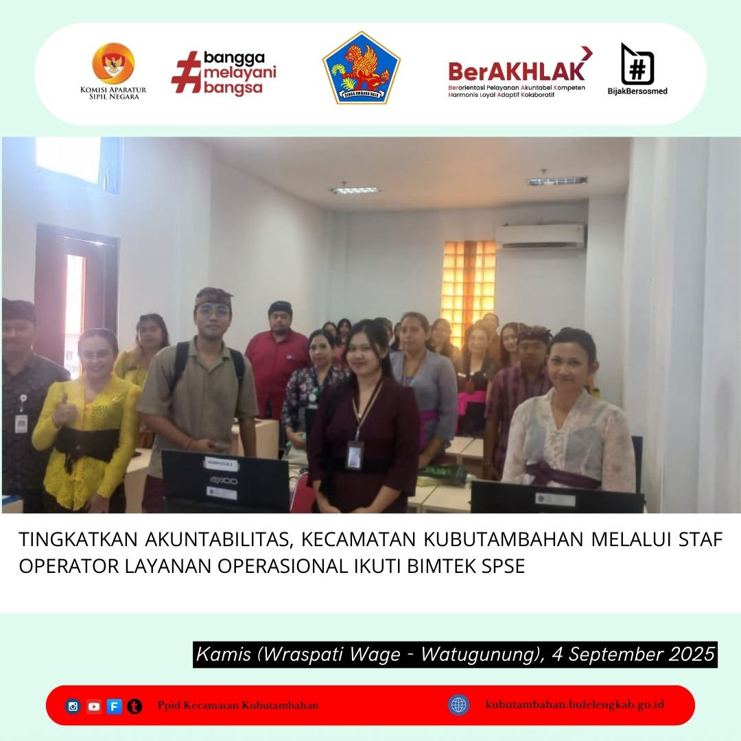 Buleleng – Guna meningkatkan pemahaman terkait tata kelola pengadaan barang dan jasa, Kecamatan Kubutambahan melalui staf Operator Layanan Operasional I Wayan Rudiadnyana Kamajaya mengikuti Bimbingan Teknis (Bimtek) Pencatatan dan Pelaporan Sistem Pengadaan Secara Elektronik (SPSE) di Ruang Laboratorium Dinas Kominfosanti Kabupaten Buleleng, Kamis (4/9/2025).