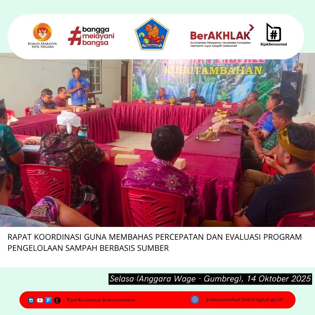 Kubutambahan – Kecamatan Kubutambahan melalui Seksi Pelayanan Terpadu mengadakan rapat koordinasi guna membahas percepatan dan evaluasi program pengelolaan sampah berbasis sumber bertempat di Ruang Rapat Aula Kantor Desa Kubutambahan. Selasa, 14 Oktober 2025.