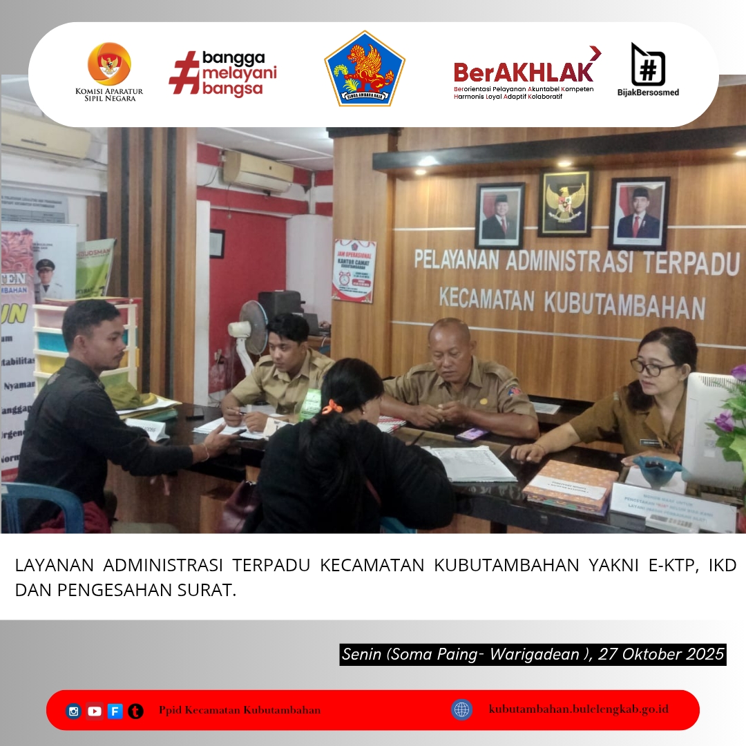 Dokumentasi Layanan Administrasi Terpadu Kecamatan Kubutambahan yakni e-KTP, IKD dan Pengesahan Surat di Ruang Pelayanan Terpadu Kantor Camat Kubutambahan. Senin, 27 Oktober 2025.