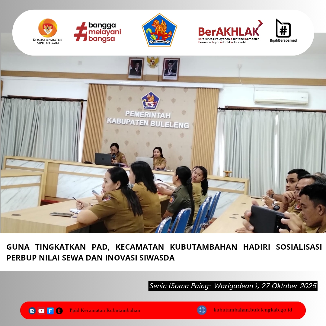 Buleleng - Kasubbag Umum dan Keuangan Kecamatan Kubutambahan Made Sukrapa menghadiri Sosialisasi Peraturan Bupati tentang Nilai Sewa, Indikator Penilaian Kinerja Pengelolaan Barang Milik Daerah (BMD), serta pengenalan Inovasi Siwasda yang diselenggarakan oleh Badan Pengelolaan Keuangan dan Pendapatan Daerah (BPKPD) Kabupaten Buleleng. Senin, 27 Oktober 2025, bertempat di Ruang Rapat BPKPD Kabupaten Buleleng.