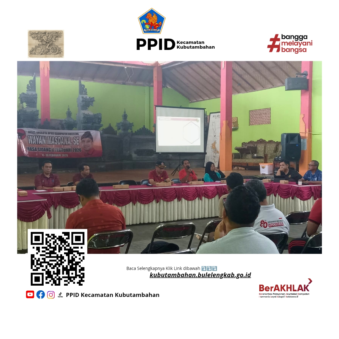 Bila, Jumat (6/2/2026) — Plt. Kasi Sosial Budaya Kecamatan Kubutambahan, I Ngurah Semarajaya Seputra, mendampingi Anggota DPRD Kabupaten Buleleng Dapil III Kecamatan Kubutambahan, I Wayan Masdana, dalam kegiatan Reses Anggota DPRD sekaligus Sosialisasi Data Tunggal Sosial Ekonomi Nasional (DTSEN) yang dilaksanakan di Ruang Rapat Kantor Desa Bila.
