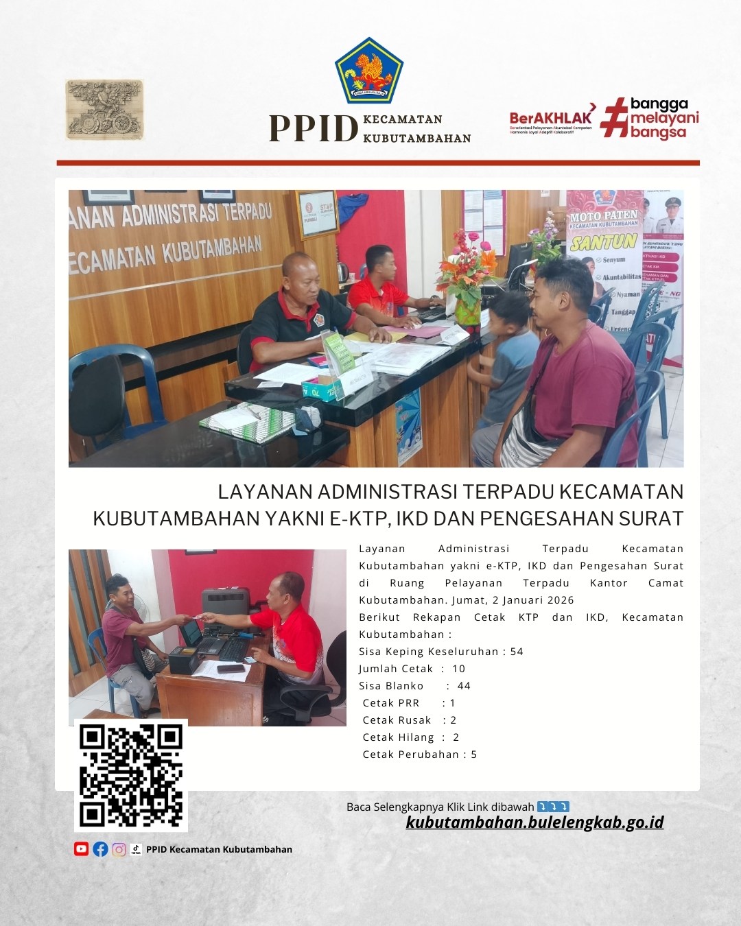 Layanan Administrasi Terpadu Kecamatan Kubutambahan yakni e-KTP, IKD dan Pengesahan Surat di Ruang Pelayanan Terpadu Kantor Camat Kubutambahan. Jumat, 2 Januari 2026