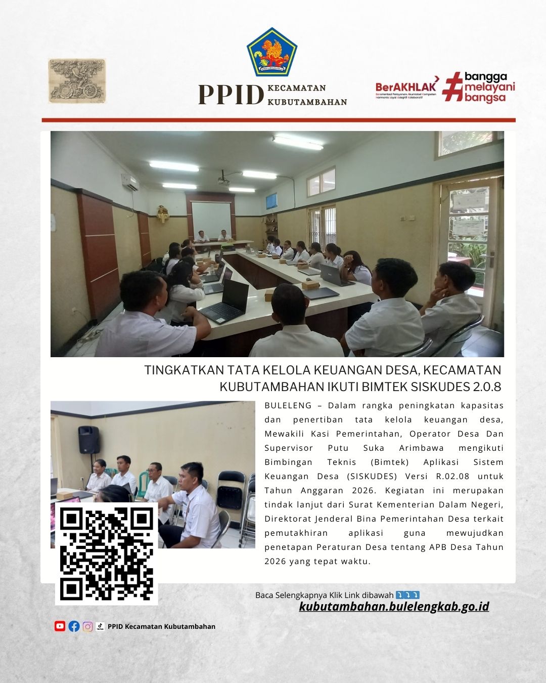 BULELENG – Dalam rangka peningkatan kapasitas dan penertiban tata kelola keuangan desa, Mewakili Kasi Pemerintahan, Operator Desa Dan Supervisor Putu Suka Arimbawa mengikuti Bimbingan Teknis (Bimtek) Aplikasi Sistem Keuangan Desa (SISKUDES) Versi R.02.08 untuk Tahun Anggaran 2026. Kegiatan ini merupakan tindak lanjut dari Surat Kementerian Dalam Negeri, Direktorat Jenderal Bina Pemerintahan Desa terkait pemutakhiran aplikasi guna mewujudkan penetapan Peraturan Desa tentang APB Desa Tahun 2026 yang tepat waktu.