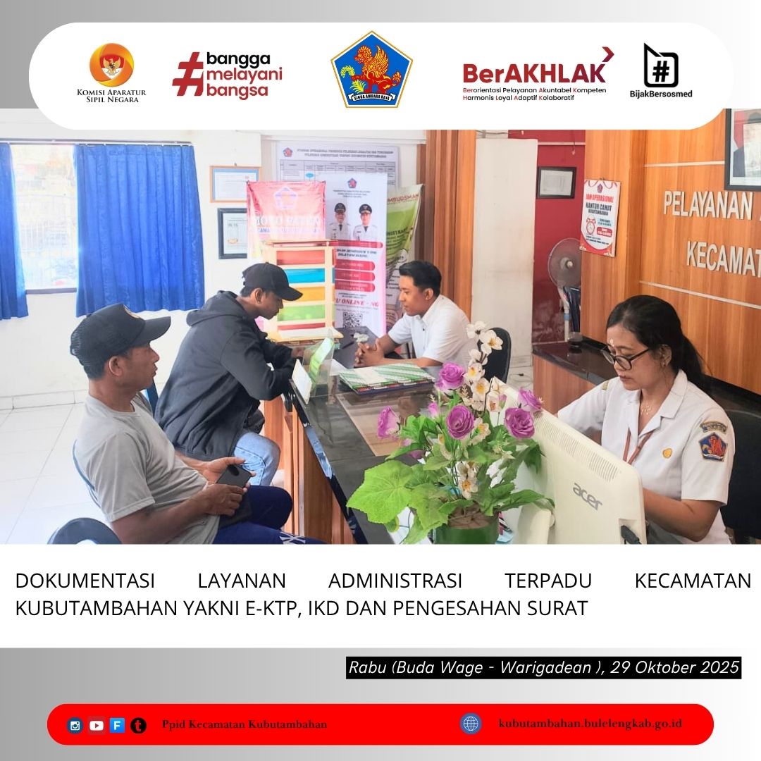 Dokumentasi Layanan Administrasi Terpadu Kecamatan Kubutambahan yakni e-KTP, IKD dan Pengesahan Surat di Ruang Pelayanan Terpadu Kantor Camat Kubutambahan. Rabu, 29 Oktober 2025.