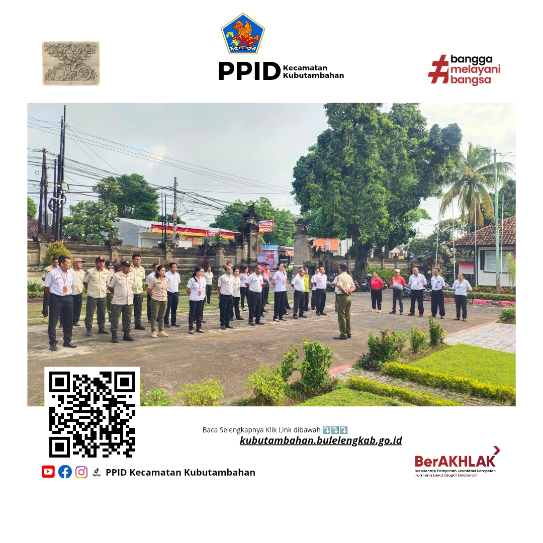 Apel pagi tersebut dihadiri oleh Plt. Sekretaris Camat Kubutambahan, para Kepala Seksi, Kasubbag, serta seluruh staf ASN Kantor Camat Kubutambahan, termasuk Koordinator Wilayah PLKB Kecamatan Kubutambahan.