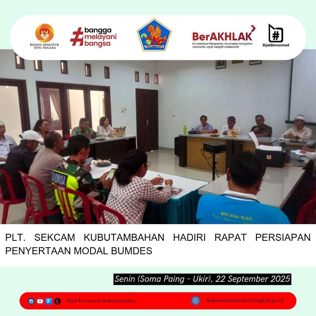 BUKTI – Plt. Sekcam Kubutambahan, Made Artawati, menghadiri rapat koordinasi di Kantor Desa Bukti pada Senin, 22 September 2025. Kehadiran beliau adalah untuk mewakili Camat Kubutambahan dalam pembahasan persiapan pelaksanaan penyertaan modal ke Badan Usaha Milik Desa (BUMDes).