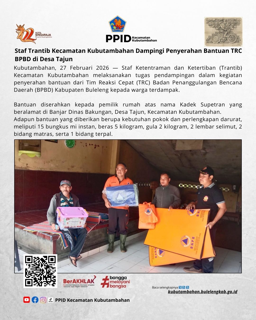 Kubutambahan, 27 Februari 2026 — Staf Ketentraman dan Ketertiban (Trantib) Kecamatan Kubutambahan melaksanakan tugas pendampingan dalam kegiatan penyerahan bantuan dari Tim Reaksi Cepat (TRC) Badan Penanggulangan Bencana Daerah (BPBD) Kabupaten Buleleng kepada warga terdampak.