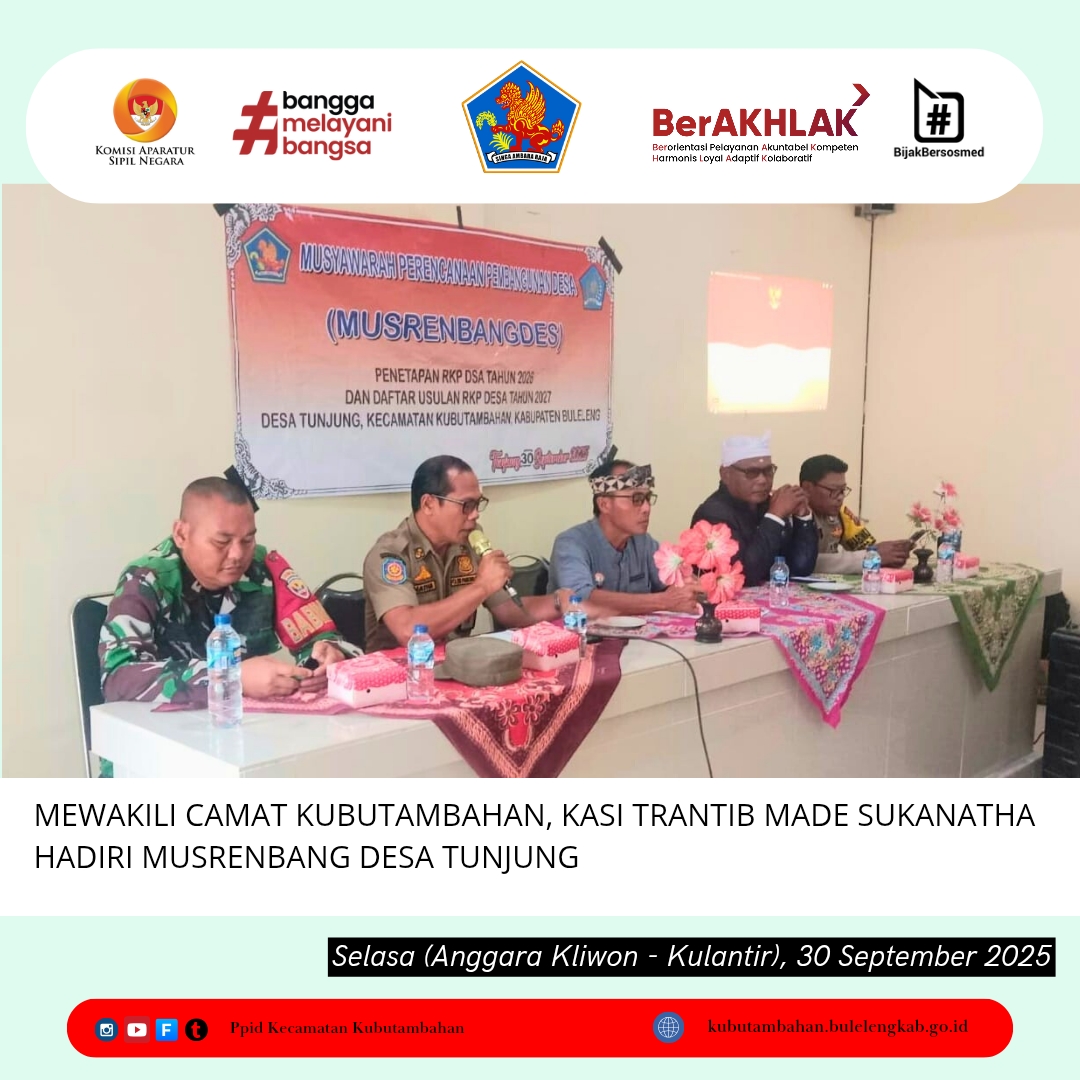 Tunjung – Kasi Trantib PolPP Kecamatan Kubutambahan, mewakili Camat Kubutambahan, menghadiri Musyawarah Perencanaan Pembangunan Desa (Musrenbangdes) Tunjung. Kegiatan ini dilaksanakan pada hari Selasa, 30 September 2025, bertempat di Lantai II Kantor Perbekel Tunjung.