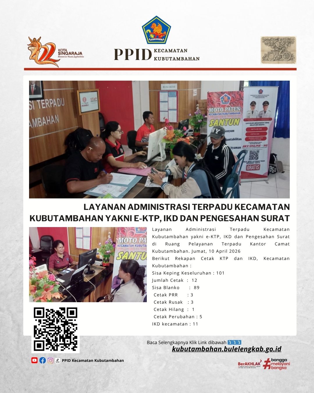 Layanan Administrasi Terpadu Kecamatan Kubutambahan yakni e-KTP, IKD dan Pengesahan Surat di Ruang Pelayanan Terpadu Kantor Camat Kubutambahan. Jumat, 10 April 2026