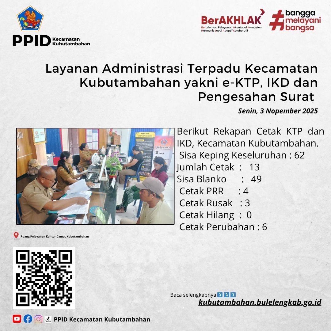 Dokumentasi Layanan Administrasi Terpadu Kecamatan Kubutambahan yakni e-KTP, IKD dan Pengesahan Surat di Ruang Pelayanan Terpadu Kantor Camat Kubutambahan. Senin, 3 November 2025.