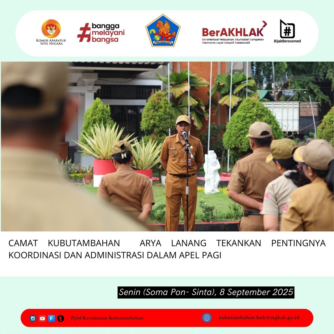 KUBUTAMBAHAN - Camat Kubutambahan, I Nyoman Arya Lanang Subahagia Putra, memimpin apel pagi di halaman Kantor Camat Kubutambahan pada Senin, 8 September 2025. Apel ini diikuti oleh seluruh staf untuk meningkatkan koordinasi dan efektivitas kerja.