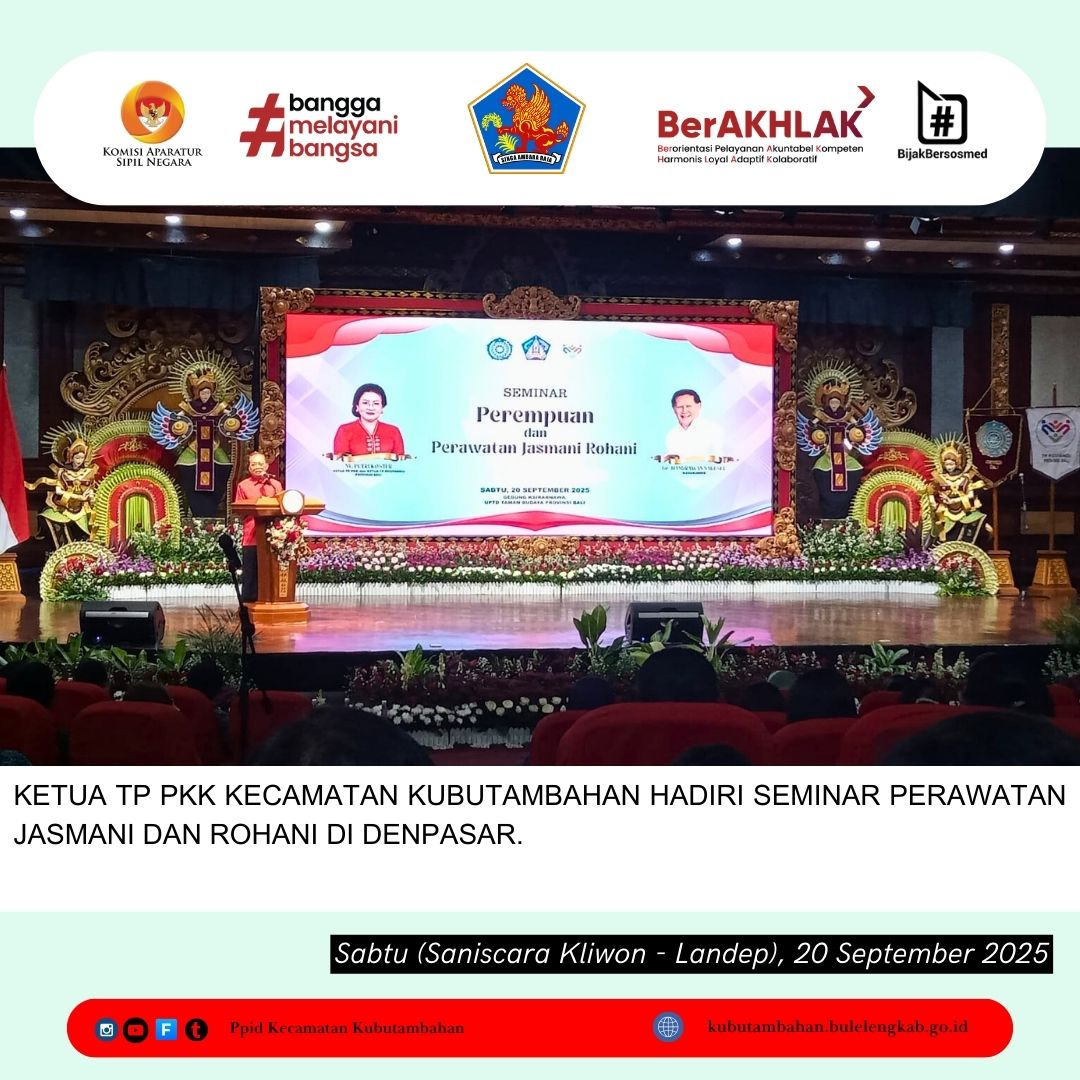 DENPASAR – Ketua Tim Penggerak Pemberdayaan Kesejahteraan Keluarga (TP PKK) Kecamatan Kubutambahan Ny. Wahyu Hirma Arya Lanang, didampingi Pokja Posyandu PKK Kecamatan, menghadiri Seminar Perempuan dan Perawatan Jasmani Rohani di Gedung Ksirarnawa, UPTD Taman Budaya Provinsi Bali, Sabtu (20/9/2025).