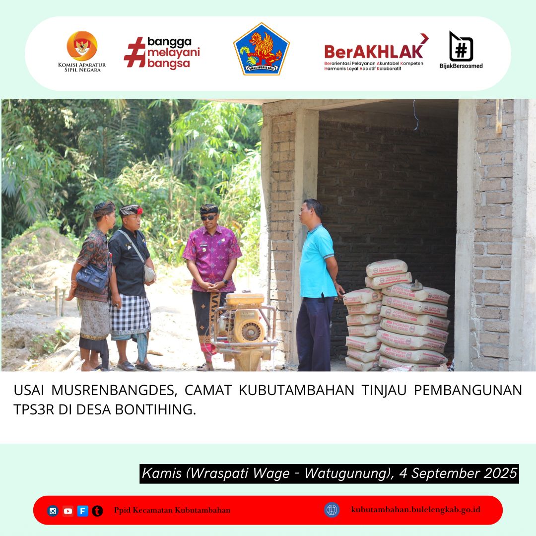 Bontihing – Sesaat setelah menghadiri Musyawarah Perencanaan Pembangunan Desa (Musrenbangdes), Camat Kubutambahan I Nyoman Arya Lanang Subahagia Putra meninjau langsung pembangunan Tempat Pengolahan Sampah Reduce, Reuse, Recycle (TPS3R) di Banjar Dinas Kawanan, Desa Bontihing. Peninjauan ini dilakukan pada Kamis (4/9/2025).
