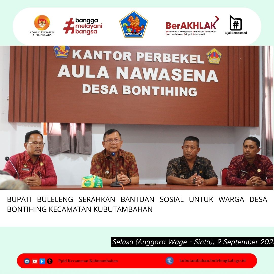 Bontihing – Pemerintah Kabupaten Buleleng melalui Dinas Sosial menyalurkan bantuan sosial berupa paket sembako dan alat bantu disabilitas kepada warga Desa Bontihing. Bupati Buleleng, I Nyoman Sutjidra, yang didampingi oleh Kepala Dinas Sosial, Putu Kariaman, Camat Kubutambahan, I Nyoman Arya Lanang Subahagia Putra, dan Perbekel Desa Bontihing menyerahkan secara simbolis bantuan yang bertempat di Aula Nawasena Desa Bontihing.