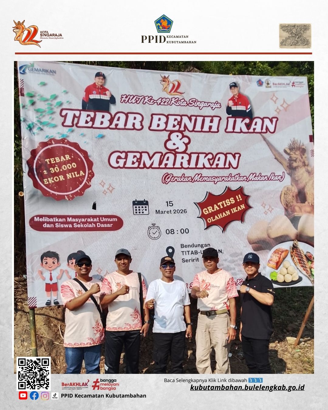 BUSUNGBIU – Camat Kubutambahan I Nyoman Arya Lanang Subahagia Putra menghadiri kegiatan Penebaran Benih Ikan dan Gerakan Memasyarakatkan Makan Ikan (Gemarikan) di Bendungan Titab, Kecamatan Busungbiu, Minggu (15/3).