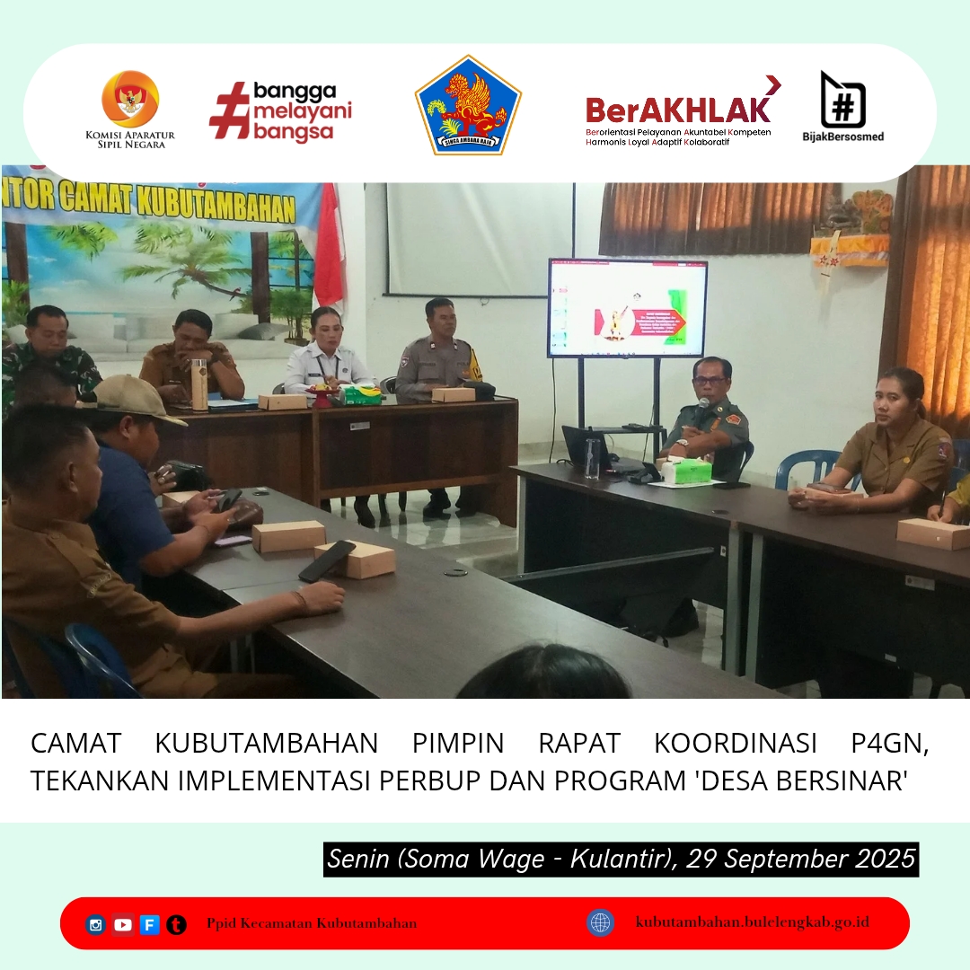 "Rencana aksi ini diawali melalui sosialisasi P4GN dan dapat terlaksana di Kecamatan Kubutambahan sesuai Keputusan Bupati Buleleng Nomor 100.3.3.2/316/HK/2025 tentang Tim Terpadu P4GN tingkat Kecamatan Kubutambahan," ujar Camat Arya Lanang.