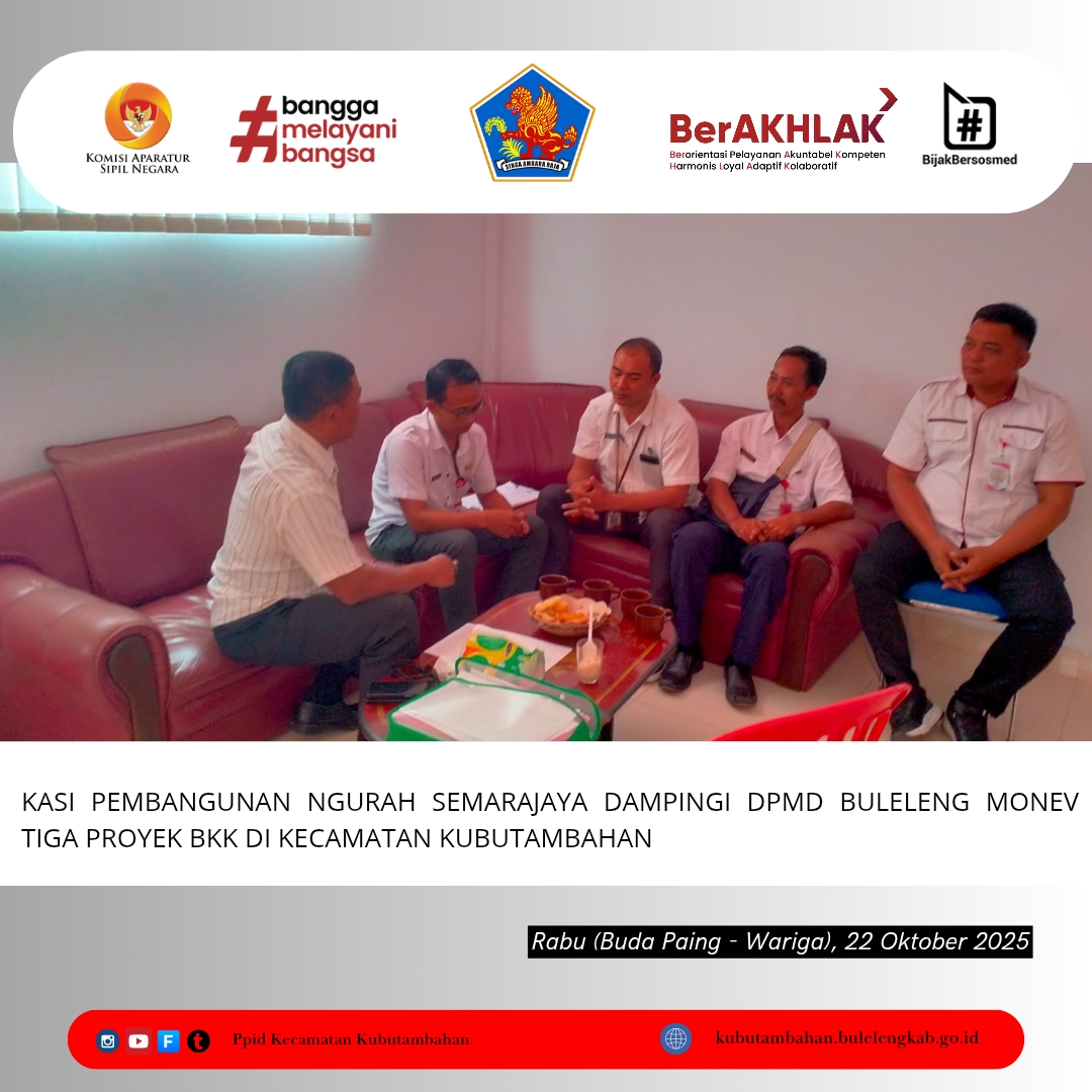KUBUTAMBAHAN – Dinas Pemberdayaan Masyarakat dan Desa (DPMD) Kabupaten Buleleng melalui Tim Monitoring dan Evaluasi (Monev) Bantuan Keuangan Khusus (BKK) melakukan kunjungan kerja ke Kecamatan Kubutambahan pada Rabu, 22 Oktober 2025.