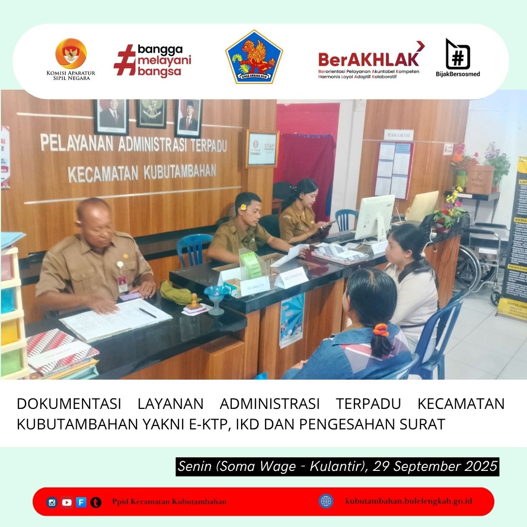 Dokumentasi Layanan Administrasi Terpadu Kecamatan Kubutambahan yakni e-KTP, IKD dan Pengesahan Surat di Ruang Pelayanan Terpadu Kantor Camat Kubutambahan. Senin, 29 September 2025
