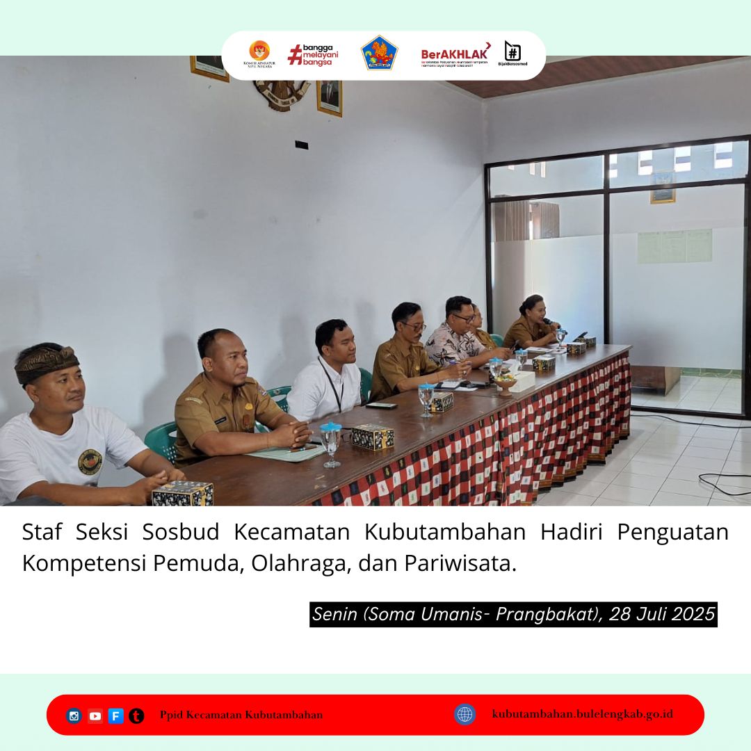 Kubutambahan, Buleleng – Staf Seksi Sosial dan Budaya (Sosbud) Kecamatan Kubutambahan menghadiri kegiatan penguatan kompetensi masyarakat di bidang kepemudaan, olahraga, dan pariwisata pada Senin, 28 Juli 2025. Bertempat di Ruang Rapat Kantor Desa Tamblang, acara ini diselenggarakan oleh Bagian Kesejahteraan Rakyat (Kesra) Sekretariat Daerah (Setda) Kabupaten Buleleng.