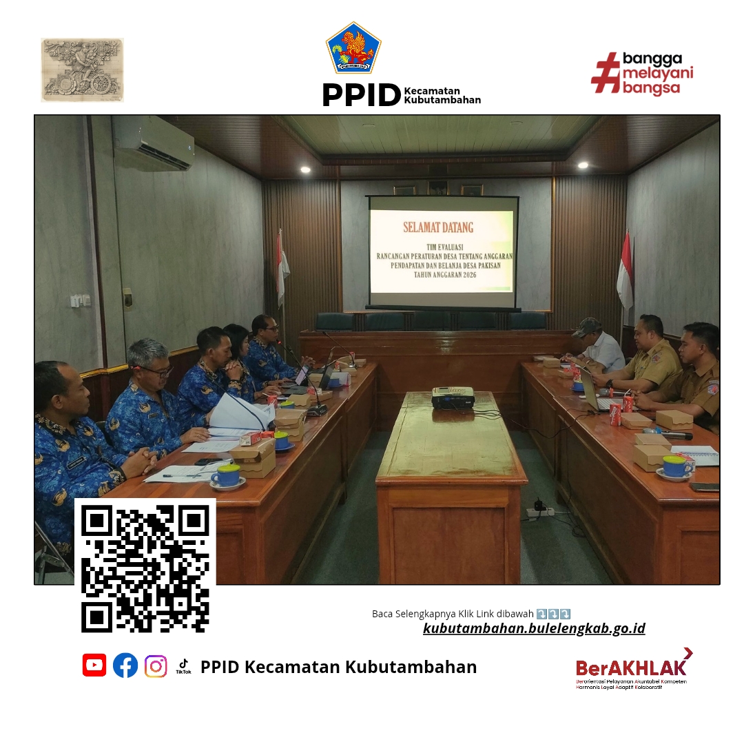 KUBUTAMBAHAN – Guna memastikan Rancangan Anggaran Pendapatan dan Belanja Desa (RAPBDes) disusun secara akuntabel, legal, dan tepat sasaran, Tim Evaluasi Kecamatan Kubutambahan, yang dikoordinir oleh Kepala Seksi Pemerintahan Made Artawati, melaksanakan evaluasi di Desa Pakisan. Kegiatan yang berfokus pada Rancangan Peraturan Desa (Perdes) tentang APBDes Tahun Anggaran 2026 ini diselenggarakan pada Senin, 1 Desember 2025, bertempat di Ruang Rapat Kantor Desa Pakisan.