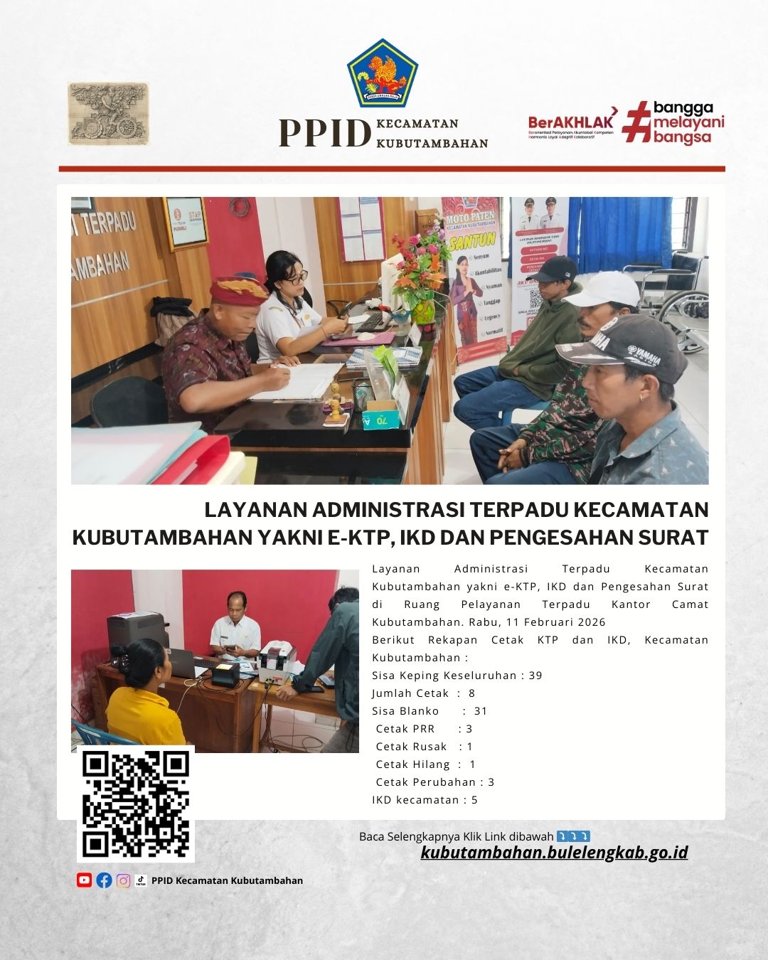 Layanan Administrasi Terpadu Kecamatan Kubutambahan yakni e-KTP, IKD dan Pengesahan Surat di Ruang Pelayanan Terpadu Kantor Camat Kubutambahan. Rabu, 11 Februari 2026