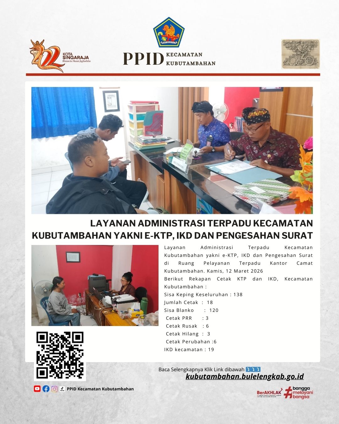 Layanan Administrasi Terpadu Kecamatan Kubutambahan yakni e-KTP, IKD dan Pengesahan Surat di Ruang Pelayanan Terpadu Kantor Camat Kubutambahan. Kamis, 12 Maret 2026