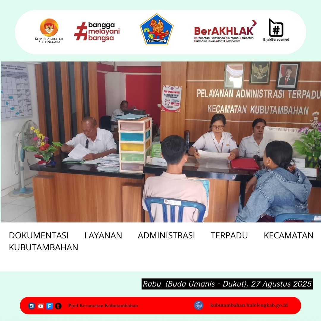 Dokumentasi Layanan Administrasi Terpadu Kecamatan Kubutambahan yakni e-KTP, IKD dan Pengesahan Surat di Ruang Pelayanan Terpadu Kantor Camat Kubutambahan. Rabu, 27 Agustus 2025
