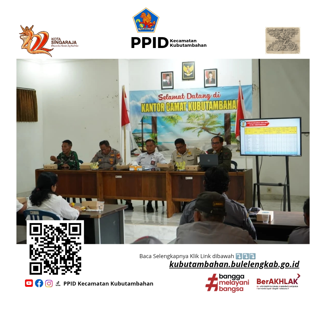 Kubutambahan, 25 Februari 2026 — Seksi Trantib dan Satpol PP Kecamatan Kubutambahan menggelar Rapat Koordinasi (Rakor) Penyelenggaraan Perlindungan Masyarakat (Linmas) serta Sosialisasi Inovasi KSTRIA Linmas Tahun 2026. Kegiatan berlangsung di Ruang Rapat Kantor Camat Kubutambahan dan dihadiri oleh Kasi Pemerintahan Desa se-Kecamatan Kubutambahan bersama masing-masing satu orang anggota Satlinmas desa.