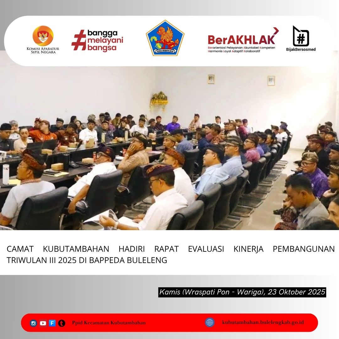 Buleleng – Camat Kubutambahan, I Nyoman Arya Lanang Subahagia Putra, turut hadir dalam Rapat Evaluasi Pelaksanaan Program Kegiatan Pembangunan Daerah Triwulan III Tahun 2025. Rapat penting ini diselenggarakan oleh Pemerintah Kabupaten Buleleng melalui Badan Perencanaan Pembangunan Daerah (Bappeda) Buleleng di Ruang Rapat Bappeda Kabupaten Buleleng pada hari Kamis, 23 Oktober 2025.