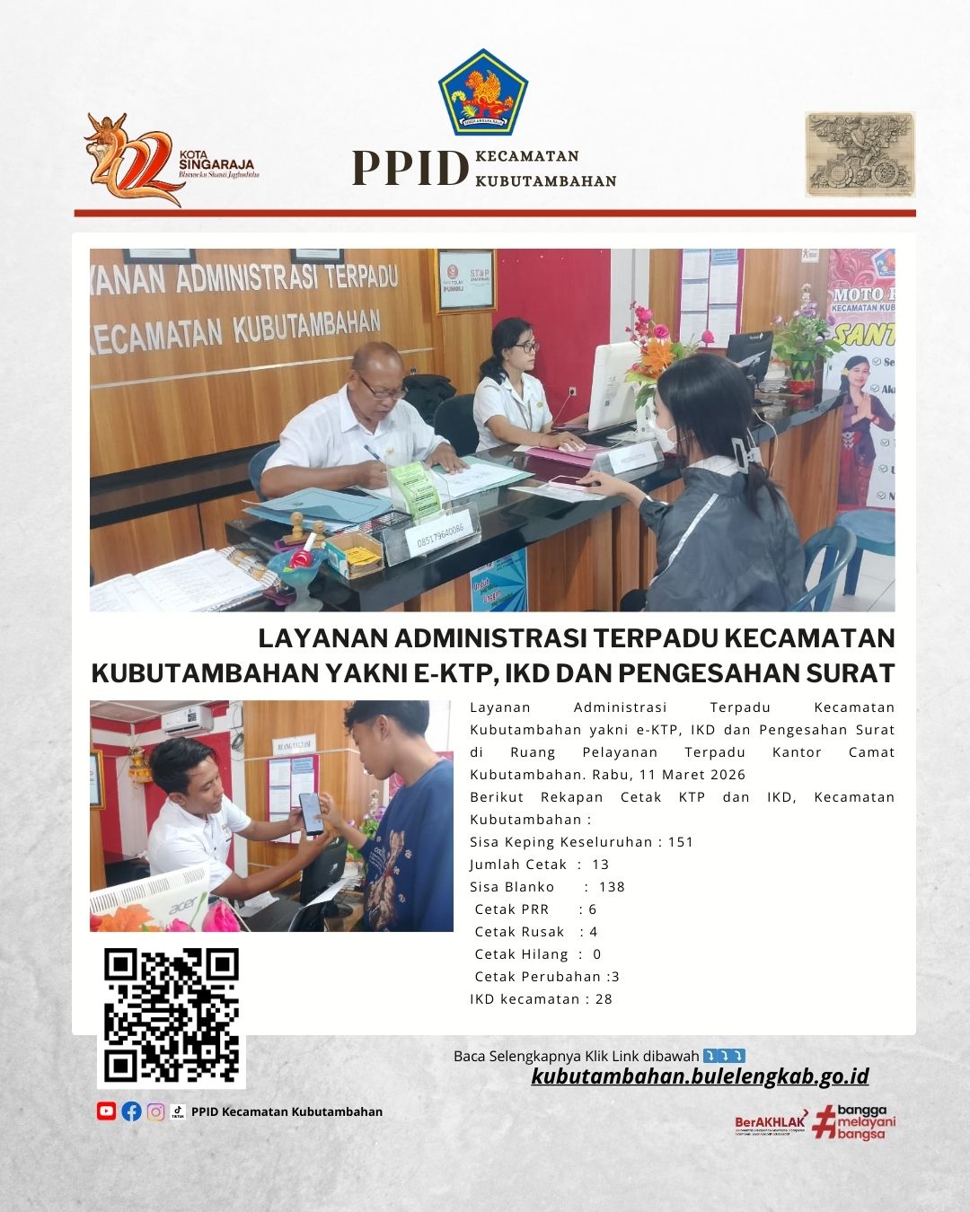 Layanan Administrasi Terpadu Kecamatan Kubutambahan yakni e-KTP, IKD dan Pengesahan Surat di Ruang Pelayanan Terpadu Kantor Camat Kubutambahan. Rabu, 11 Maret 2026