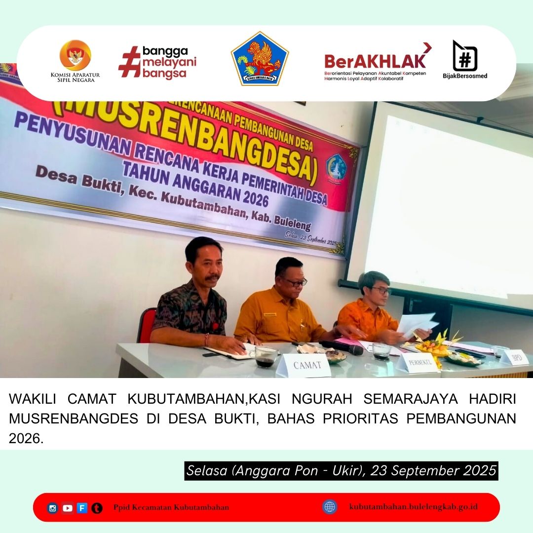 BUKTI– Camat Kubutambahan yang diwakili oleh Kepala Seksi Pembangunan, I Ngurah Semarajaya Seputra, menghadiri Musyawarah Perencanaan Pembangunan Desa (Musrenbangdes) di Desa Bukti pada Selasa, 23 September 2025. Pertemuan ini bertujuan untuk menyusun Rencana Kerja Pemerintah Desa (RKPDes) tahun 2026 dan Daftar Usulan RKPDes (DU RKPDes) tahun 2027.