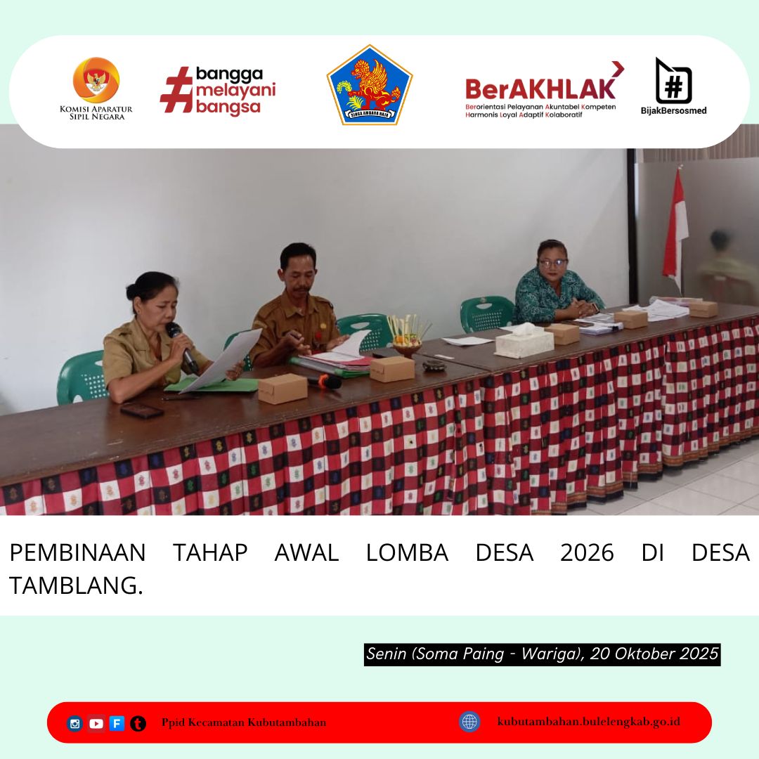 Kasi Pembangunan I Ngurah Semarajaya Seputra menjelaskan bahwa pembinaan ini adalah tahapan awal untuk mengukur tingkat kesiapan Desa Tamblang. "Pembinaan ini merupakan tahapan awal untuk melihat sejauh mana kesiapan Desa Tamblang dalam mengikuti Lomba Desa Tahun 2026," ujar I Ngurah Semarajaya Seputra. Beliau menegaskan pentingnya memastikan seluruh aspek, mulai dari administrasi, data, hingga kesiapan sumber daya manusia benar-benar matang.