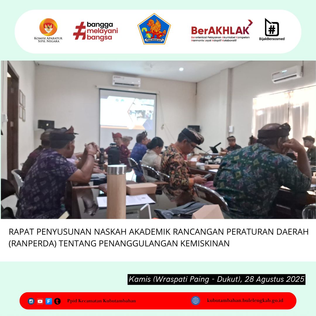 Buleleng — Staf Seksi Sosial Budaya Kecamatan Kubutambahan, Made Sudiasih, mewakili Pelaksana Tugas (Plt.) Kasi Sosial Budaya menghadiri rapat penyusunan Naskah Akademik Rancangan Peraturan Daerah (Ranperda) tentang Penanggulangan Kemiskinan. Acara yang berlangsung pada Kamis, 28 Agustus 2025, di ruang rapat Brida ini dihadiri oleh berbagai pihak, termasuk perwakilan dari Kemenkumham Kanwil Bali.
