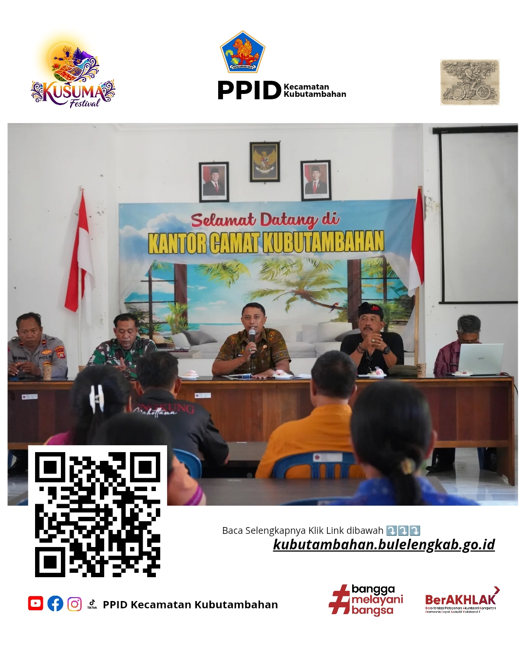 Kubutambahan – Camat Kubutambahan, I Nyoman Arya Lanang Subahagia Putra, memimpin rapat penetapan Festival Kecamatan Kubutambahan Tahun 2026 yang berlangsung di Ruang Rapat Kantor Camat Kubutambahan, Selasa (14/4/2026). Rapat tersebut dihadiri Anggota DPRD Kabupaten Buleleng Dapil Kubutambahan, unsur Forum Koordinasi Pimpinan Kecamatan (Forkopimcam), para perbekel se-Kecamatan Kubutambahan, Korwil Kementrian Agama Hindu Kecamatan Kubutambahan, kepala sekolah SMA/K, kelian desa adat, Kepala Puskesmas Kubutambahan I dan II, serta pejabat struktural di lingkungan Kantor Camat Kubutambahan.