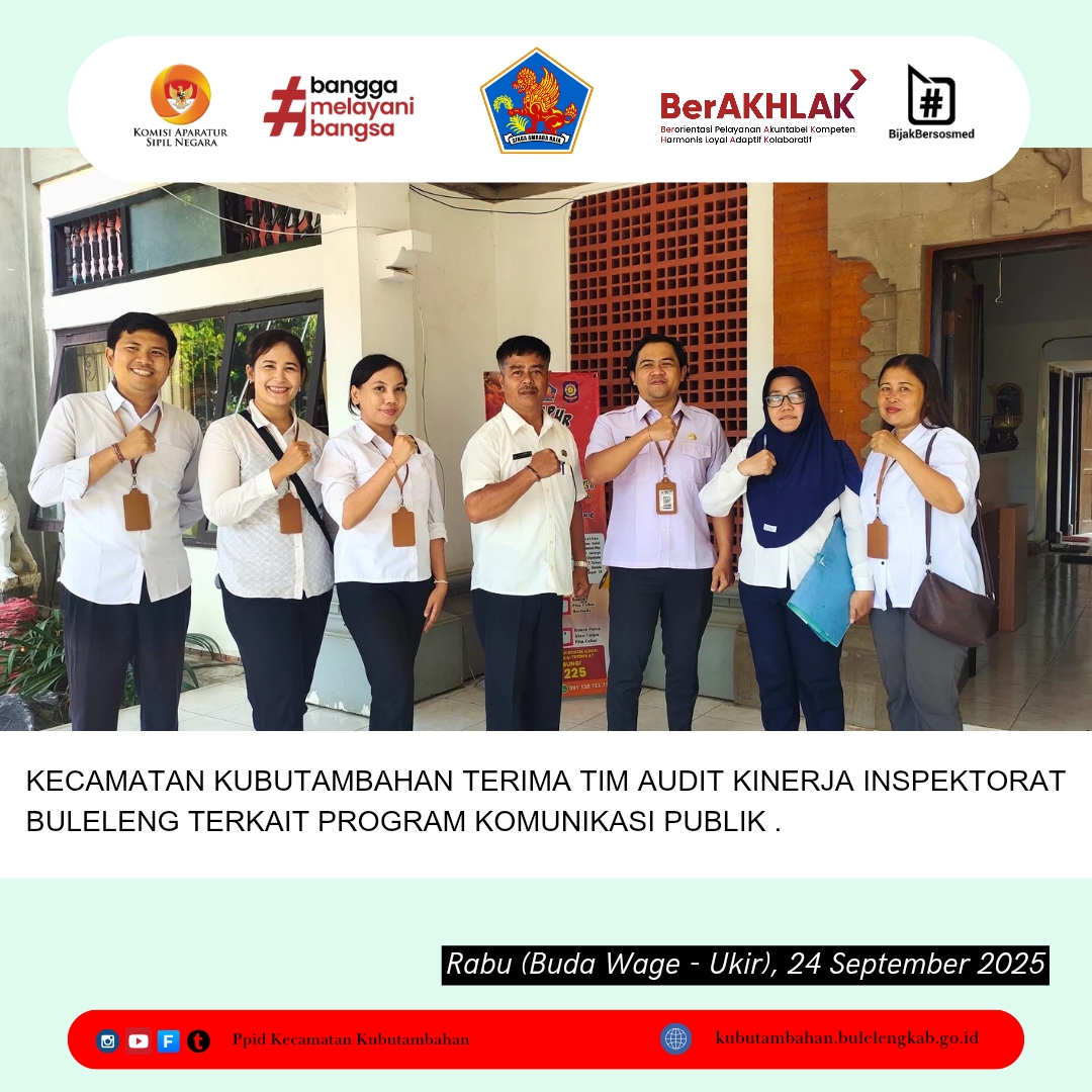 Tim Inspektorat Kabupaten Buleleng diterima langsung oleh Kasubbag Umum dan Keuangan Kecamatan Kubutambahan Made Sukrapa, bersama dengan Operator Website di Ruang Kerja Sekretaris Camat pada Rabu, 24 September 2025.