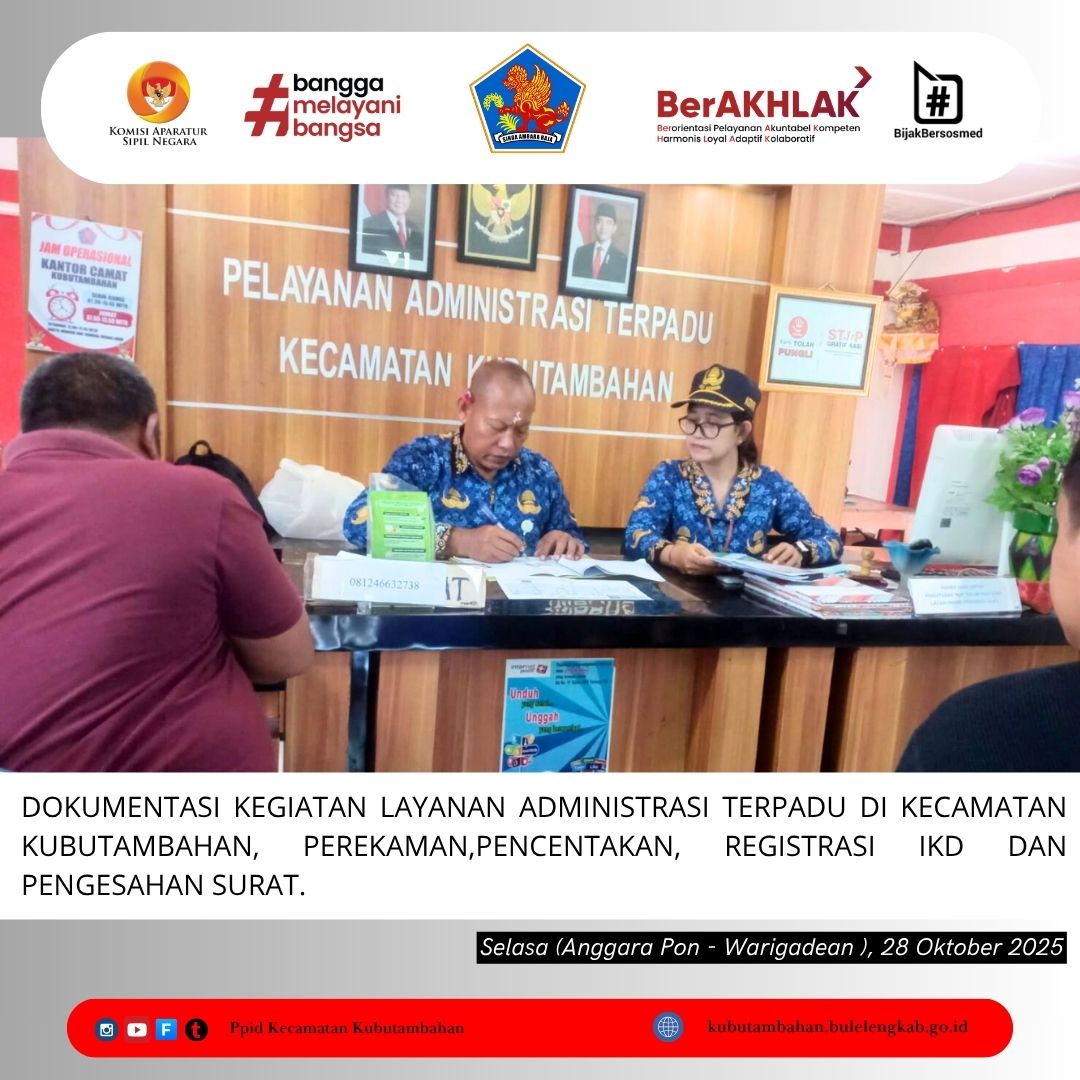 Dokumentasi Layanan Administrasi Terpadu Kecamatan Kubutambahan yakni e-KTP, IKD dan Pengesahan Surat di Ruang Pelayanan Terpadu Kantor Camat Kubutambahan. Selasa, 28 Oktober 2025.