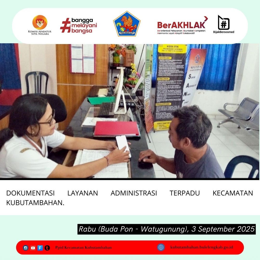 Dokumentasi Layanan Administrasi Terpadu Kecamatan Kubutambahan yakni e-KTP, IKD dan Pengesahan Surat di Ruang Pelayanan Terpadu Kantor Camat Kubutambahan. Rabu, 3 September 2025
