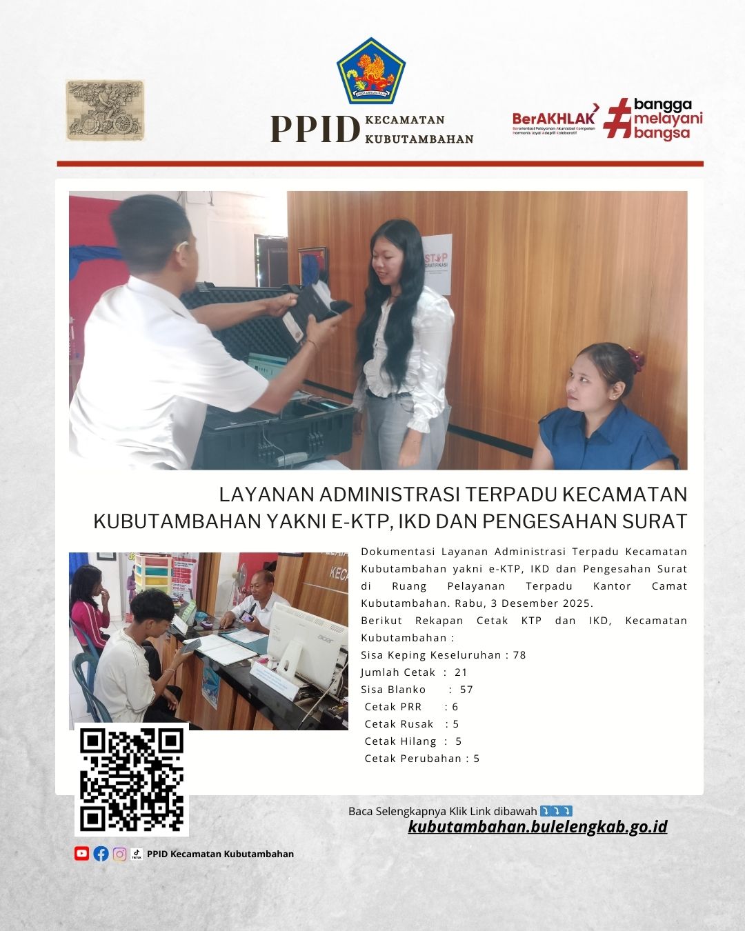 Dokumentasi Layanan Administrasi Terpadu Kecamatan Kubutambahan yakni e-KTP, IKD dan Pengesahan Surat di Ruang Pelayanan Terpadu Kantor Camat Kubutambahan. Rabu, 3 Desember 2025.