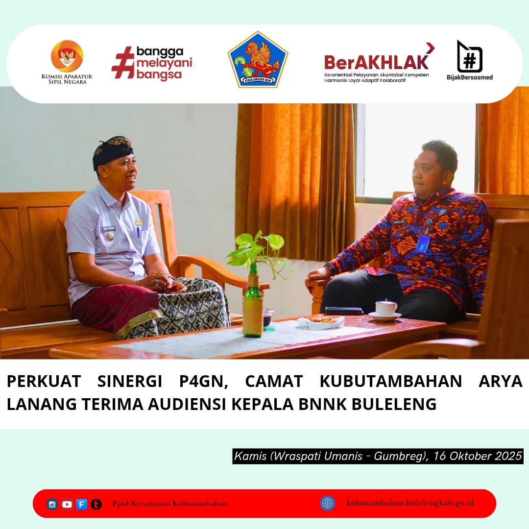 Kubutambahan – Dalam upaya memperkuat koordinasi program Pencegahan dan Pemberantasan Penyalahgunaan dan Peredaran Gelap Narkotika (P4GN), Camat Kubutambahan, I Nyoman Arya Lanang Subahagia Putra, S.STP., M.AP., menerima audiensi dari Kepala Badan Narkotika Nasional Kabupaten (BNNK) Buleleng, Komang Yuda Murdianto, S.H., M.H. Pertemuan yang digelar di Ruang Kerja Camat Kubutambahan pada hari Kamis, 16 Oktober 2025, ini menjadi langkah strategis kedua pihak dalam menekan angka penyalahgunaan narkoba di wilayah Kecamatan Kubutambahan.