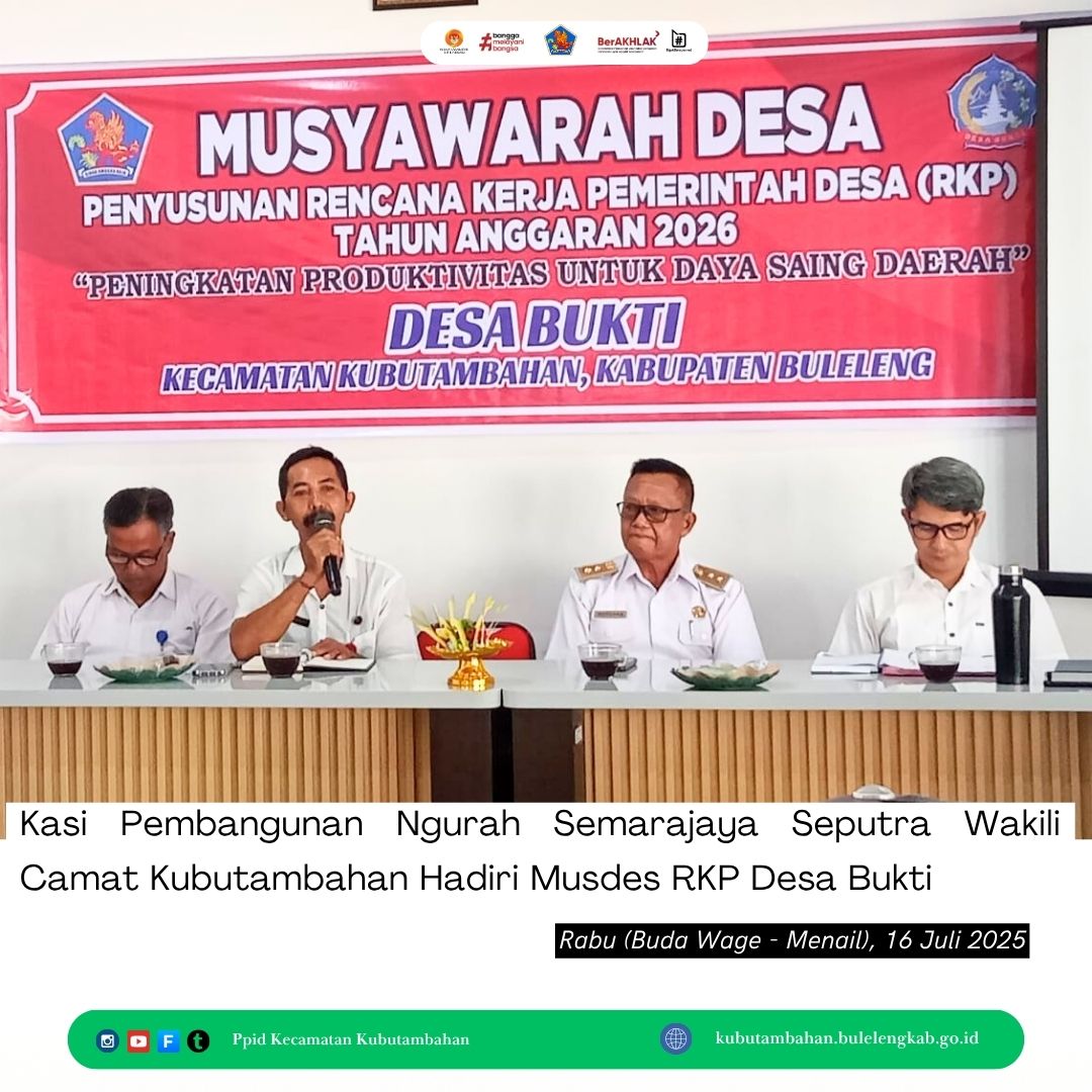 BUKTI, 16 Juli 2026 – Kepala Seksi Pembangunan (Kasi Pembangunan) Ngurah Semarajaya Seputra mewakili Camat Kubutambahan menghadiri Musyawarah Desa (Musdes) Rencana Kerja Pemerintah Desa (RKPDes) di Desa Bukti.