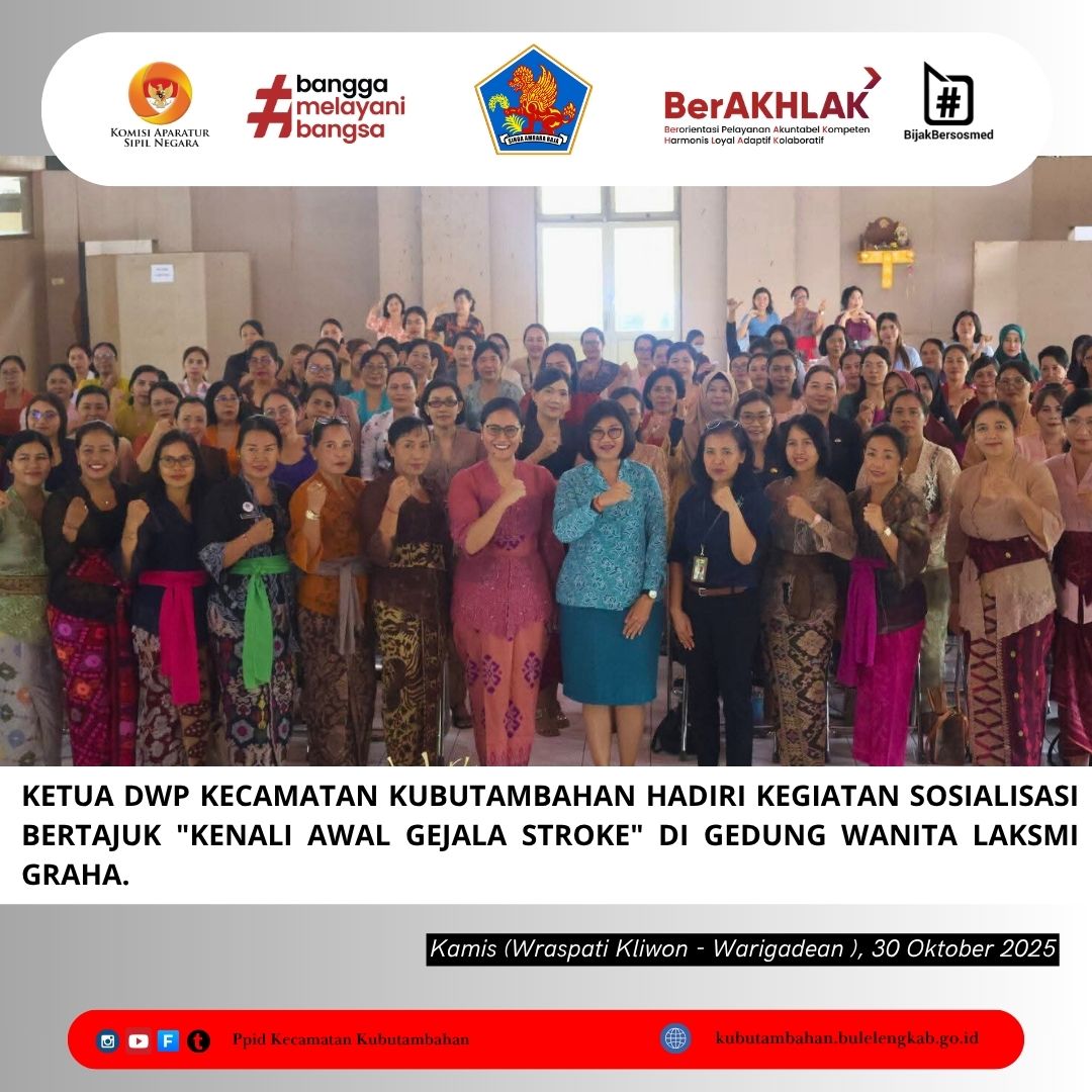 Buleleng — Ketua Dharma Wanita Persatuan (DWP) Kecamatan Kubutambahan, Ny. Wahyu Hirma Arya Lanang, menunjukkan komitmennya terhadap peningkatan kesehatan keluarga Aparatur Sipil Negara (ASN) dengan menghadiri kegiatan sosialisasi bertajuk "Kenali Awal Gejala Stroke". Acara penting ini diselenggarakan oleh DWP Kabupaten Buleleng di Gedung Wanita Laksmi Graha Singaraja, Kamis (30/10).