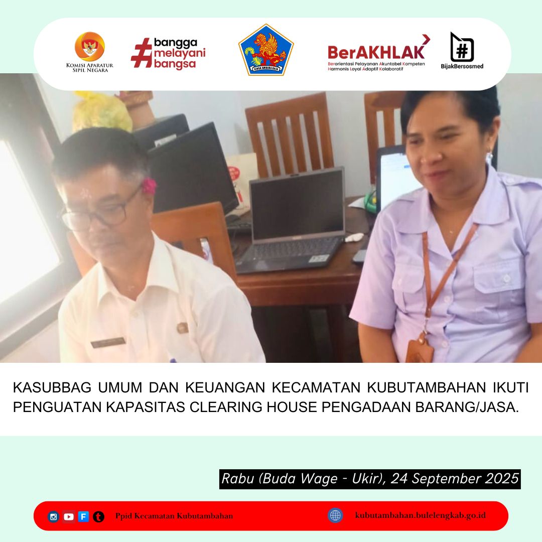 Kubutambahan – Kepala Subbagian Umum dan Keuangan Kantor Camat Kubutambahan, Made Sukrapa, didampingi stafnya, Ni Putu Budi Artini, menghadiri rapat melalui zoom meeting dengan agenda “Penguatan Kapasitas Clearing House Pengadaan Barang/Jasa Pemerintah Kabupaten Buleleng.” Kegiatan ini diselenggarakan pada hari Rabu, 24 September 2025, bertempat di ruang kerja Pejabat Penatausahaan Keuangan (PPK) Kantor Camat Kubutambahan.