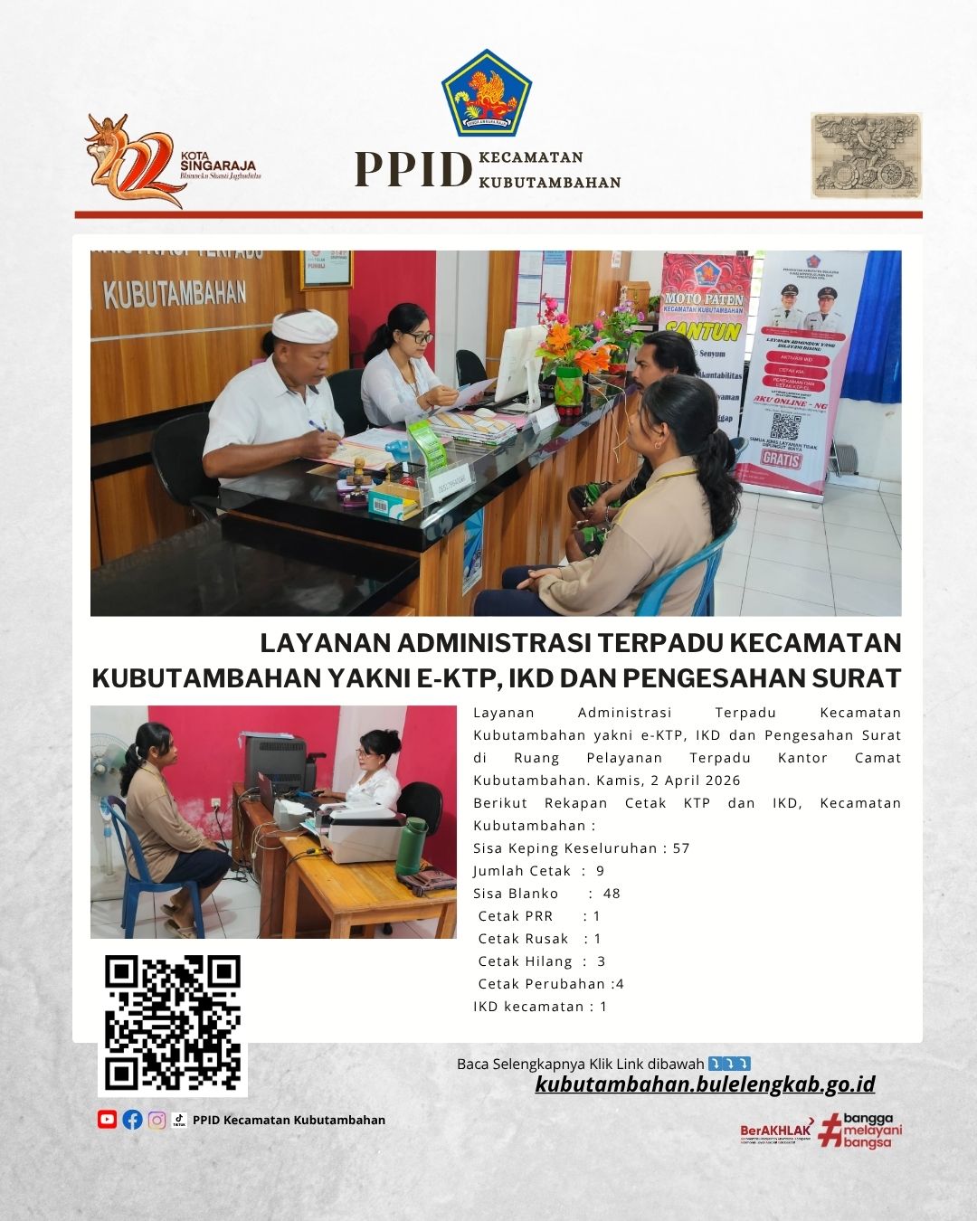 Layanan Administrasi Terpadu Kecamatan Kubutambahan yakni e-KTP, IKD dan Pengesahan Surat di Ruang Pelayanan Terpadu Kantor Camat Kubutambahan. Kamis, 2 April 2026